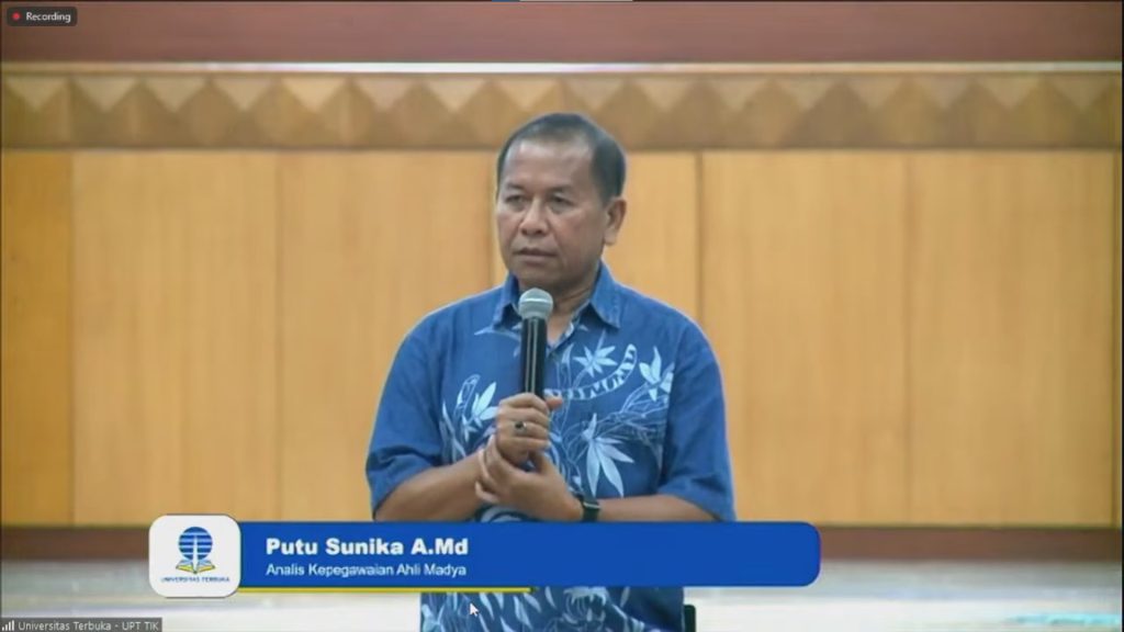 Sosialisasi Manajemen PUT PK diselenggarakan pada Jumat, 26 April 2024 secara hybrid, yaitu secara luring di Universitas Terbuka Convention Center (UTCC) di Kantor Pusat UT- Pondok Cabe Tangerang Selatan, dan secara daring melalui Zoom Meeting. Sosialisasi ini turut dihadiri oleh Wakil Rektor Bidang Keuangan, Sumber Daya, dan Umum yang membuka acara sekaligus memberi arahan. Kepala Pusat Sumber Daya Manusia menyampaikan laporan kegiatan. Analis Kepegawaian Ahli Madya Putu Sunika, A.Md. selaku Narasumber pada kegiatan sosialisasi ini dan kegiatan ditutup oleh Manajer Perencanaan dan Penempatan Sumber Daya Manusia, Peserta yang hadir pada sosialisasi ini sebanyak 129 orang UT Pusat dan 45 orang UT Daerah.